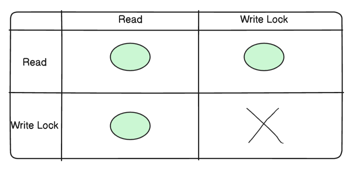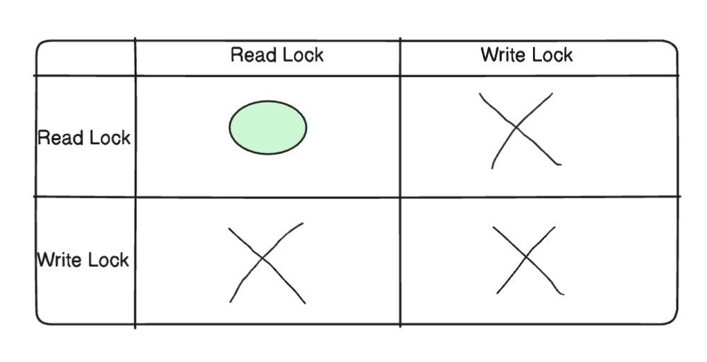 하지만 Read Lock - Write Lock, Write Lock - Write Lock은 하나를 획득하면 다른 하나는 획득할 수 없습니다.