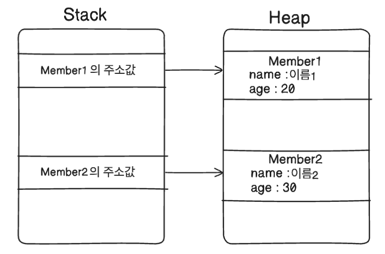 스택에 객체의 주소 값을 저장하고 이를 참조하여 Heap에 접근하는 방식입니다.