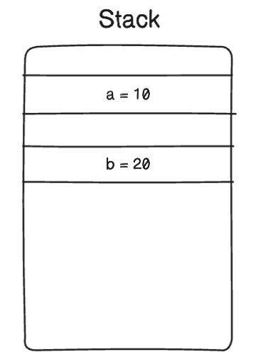 자바를 예시로 들겠습니다. 정수형의 데이터 a, b가 있을 때 이 값들은 모두 스택에 저장되어 있습니다.