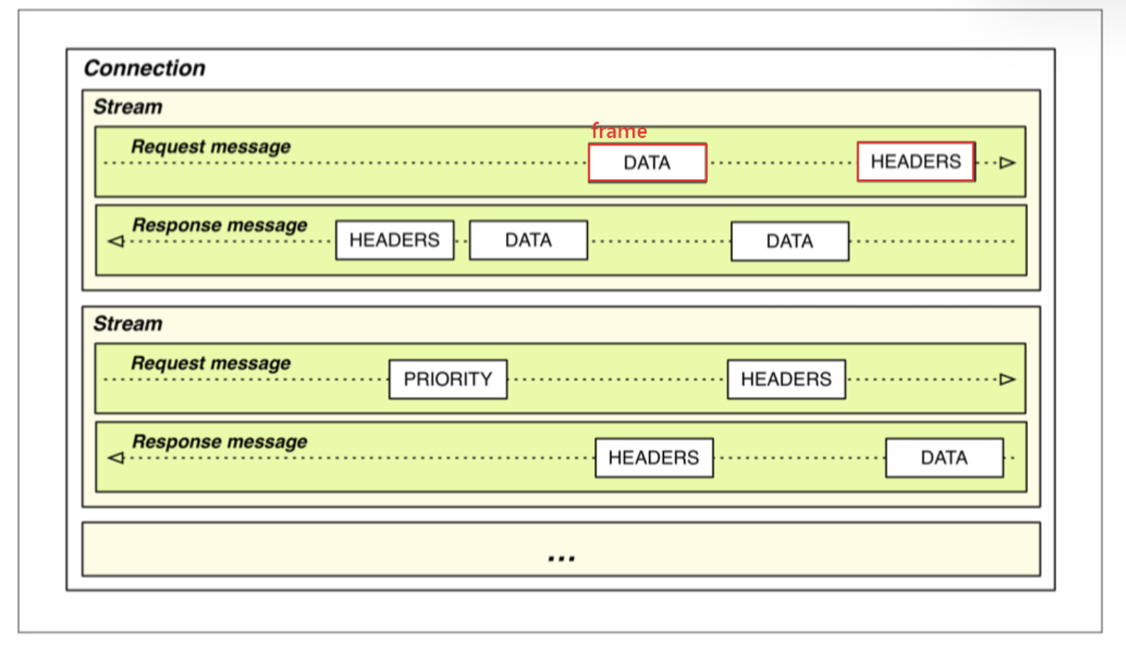 그림을 통해 살펴보면 커넥션 안에 여러 스트림(양방향 흐름)이 존재하고 스트림 안에 여러 요청/응답 메세지가 존재하고