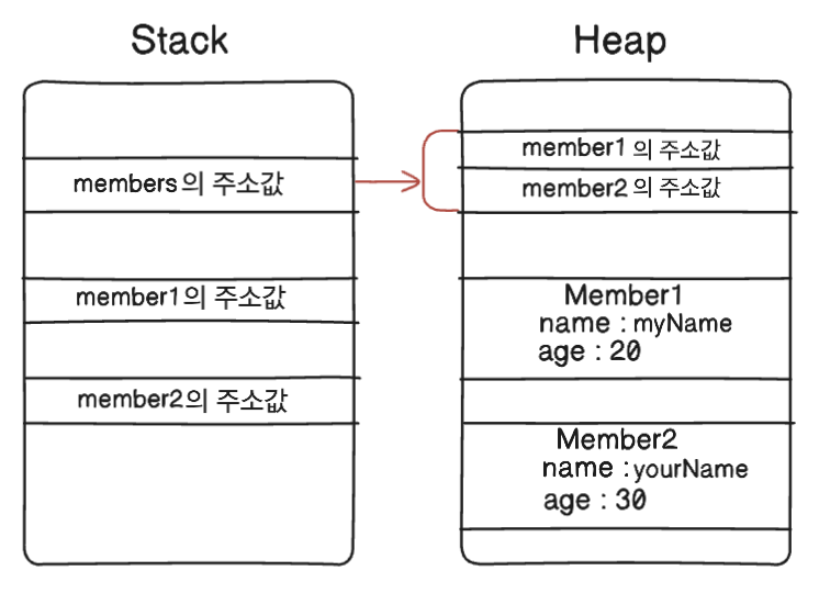 배열의 원소가 Reference type인 경우에는 Stack에 members의 주소값이 저장되어 있고 Heap 영역에는