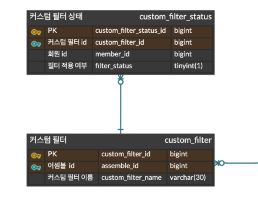 다음에 이렇게 생성된 로우에 custom_filter_id를 이용하여 custom_filter_status 테이블에 해당 어셈블에 있는