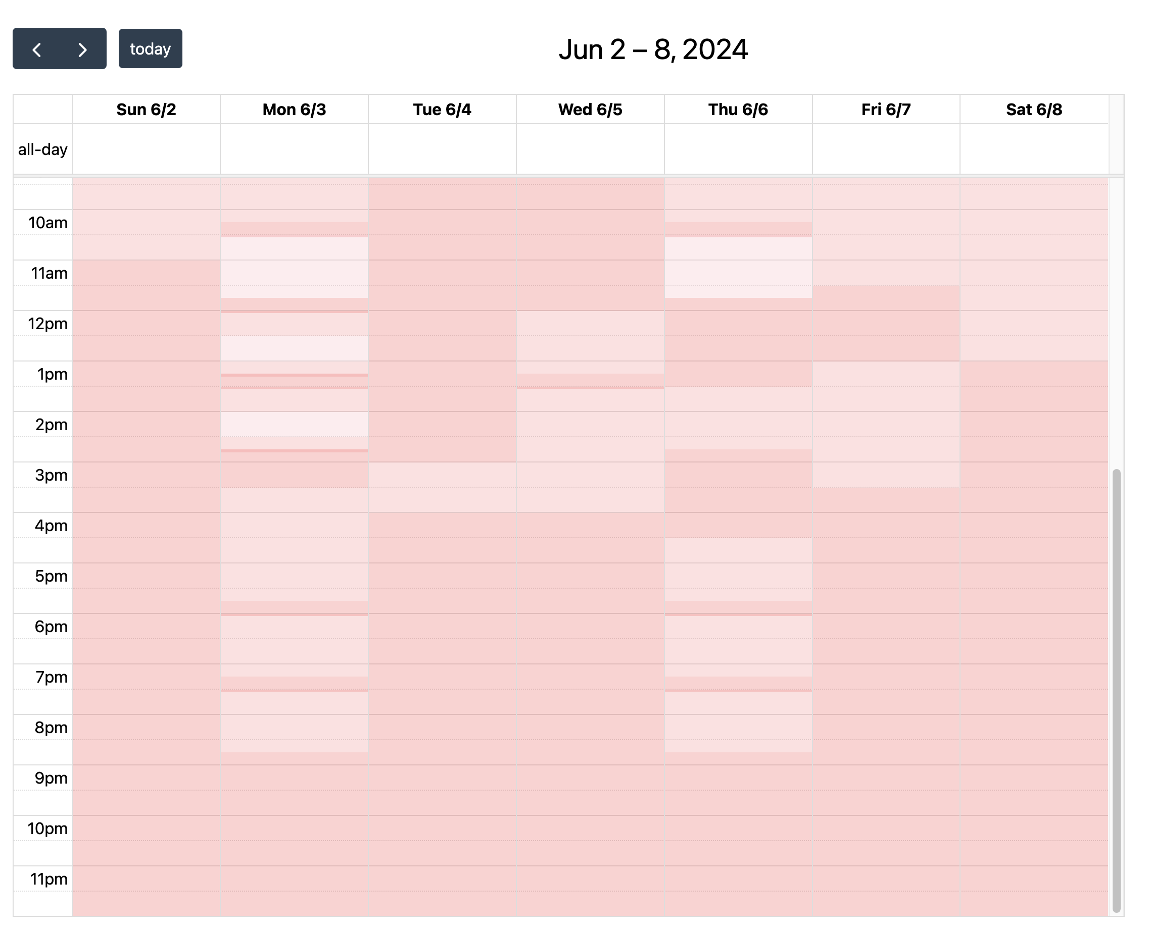색상이 진할 수록 가능한 사람이 많은 시간대를 의미하며 해당 캘린더를 클릭하면 가능한 회원의 정보를 볼 수 있습니다.