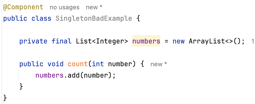 그렇기 때문에 싱글톤 객체를 사용할 때는 되도록이면 필드 값을 가지지 않도록 해야합니다.
