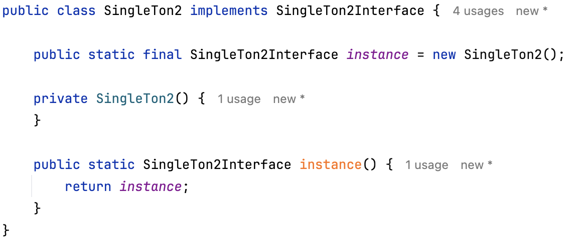 SingleTon1 클래스, SingleTon2Interface 인터페이스, SingleTon2 클래스가 있다고 해봅시다.