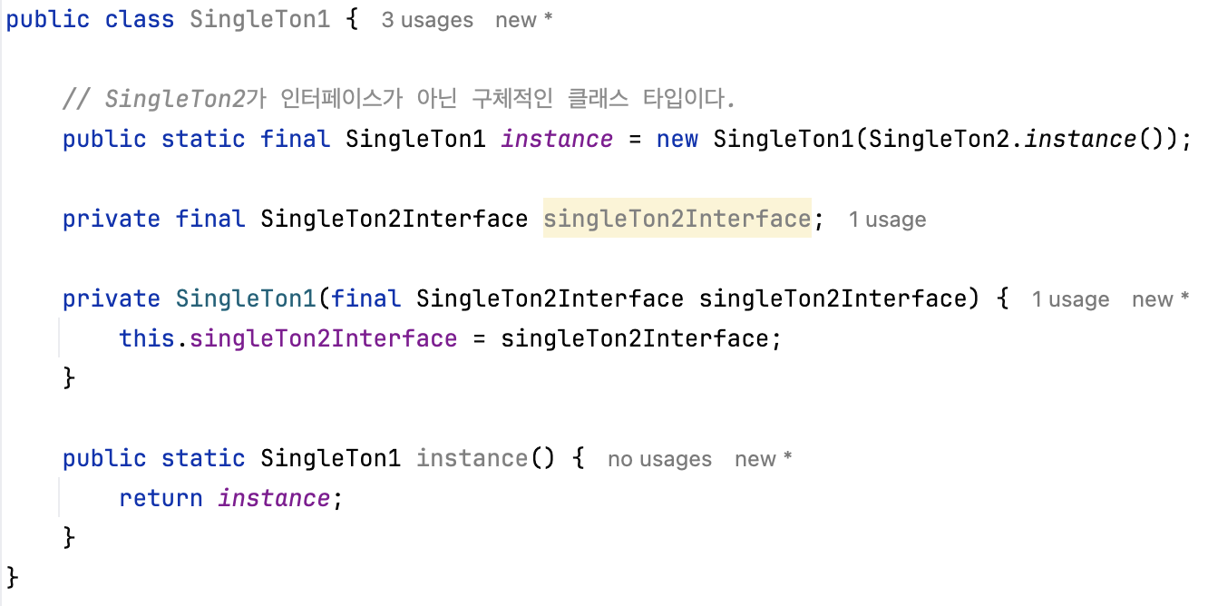 이러한 방식으로는 인터페이스에 의존하지 않고 구체적인 클래스인 SingleTon2에 의존할 수 밖에 없습니다.