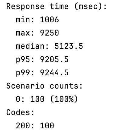 쓰레드 개수를 200개로 늘렸을 때는 10000개의 요청이 모두 성공하였고 p99는 5600ms가 나왔습니다.
