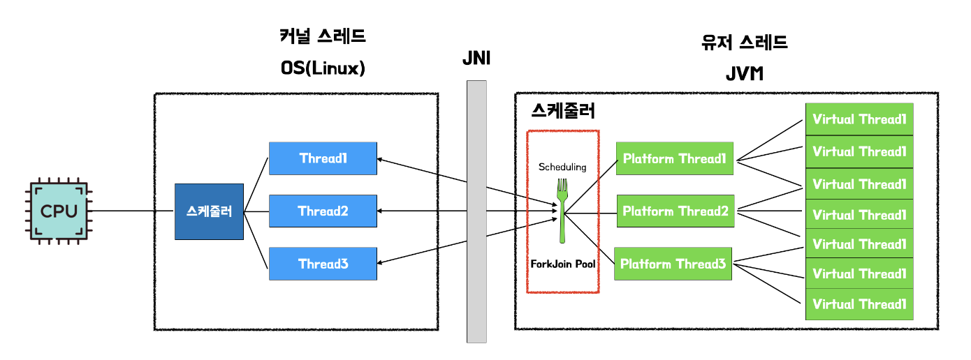 ForkJoinPool은 플랫폼 쓰레드(우리가 알고 있는 쓰레드)를 관리하고 Virtual 쓰레드에게 작업을 분배하는 것입니다.