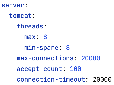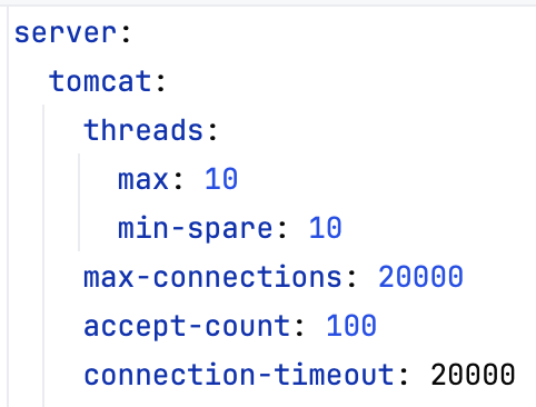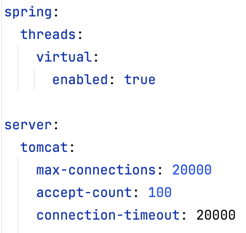 Virtual Thread 활용하기 위한 설정을 추가하고 적용되지 않는 max, min-spare 설정은 지웠습니다.