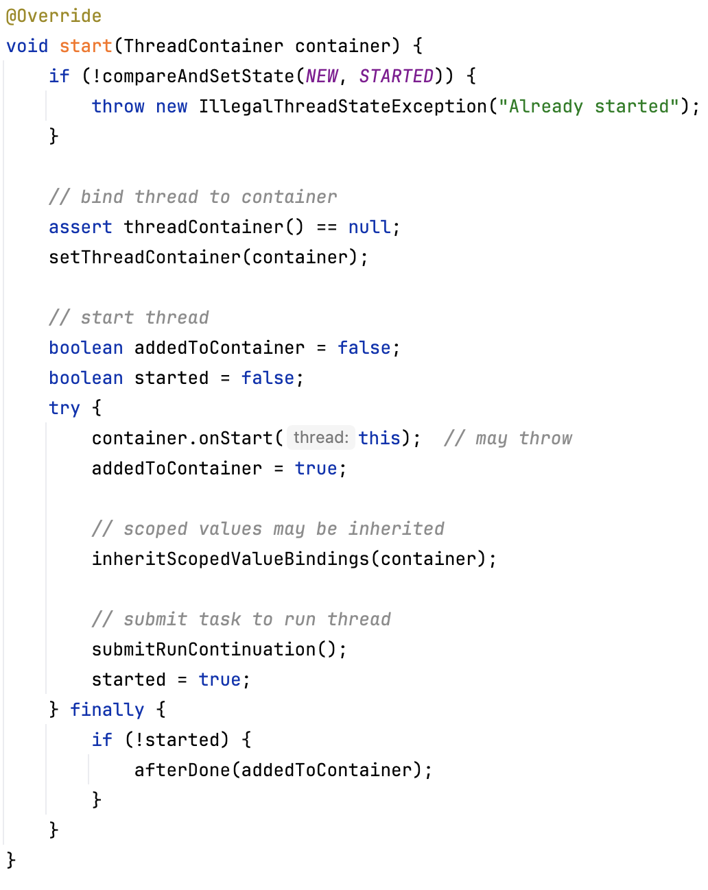 Virtual Thread의 start() 메소드는 어떨까요? (Virtual Thread의 상속을 따라가보면 Thread 클래스가 존재)