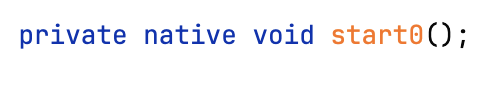 일반 쓰레드는 실행할 때 start0() JNI 메소드를 호출하게 됩니다. 이 부분은 자바 코드가 아니라 C나 C++로 되어 있는 코드로