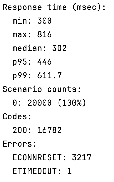 20000개 중에 16782개를 처리하였고 p99는 611.7ms이 나왔습니다.
