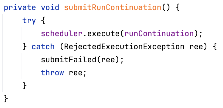대신에 submitRunContinuation() 이라는 메소드를 볼 수 있는데 이 메소드를 살펴보면