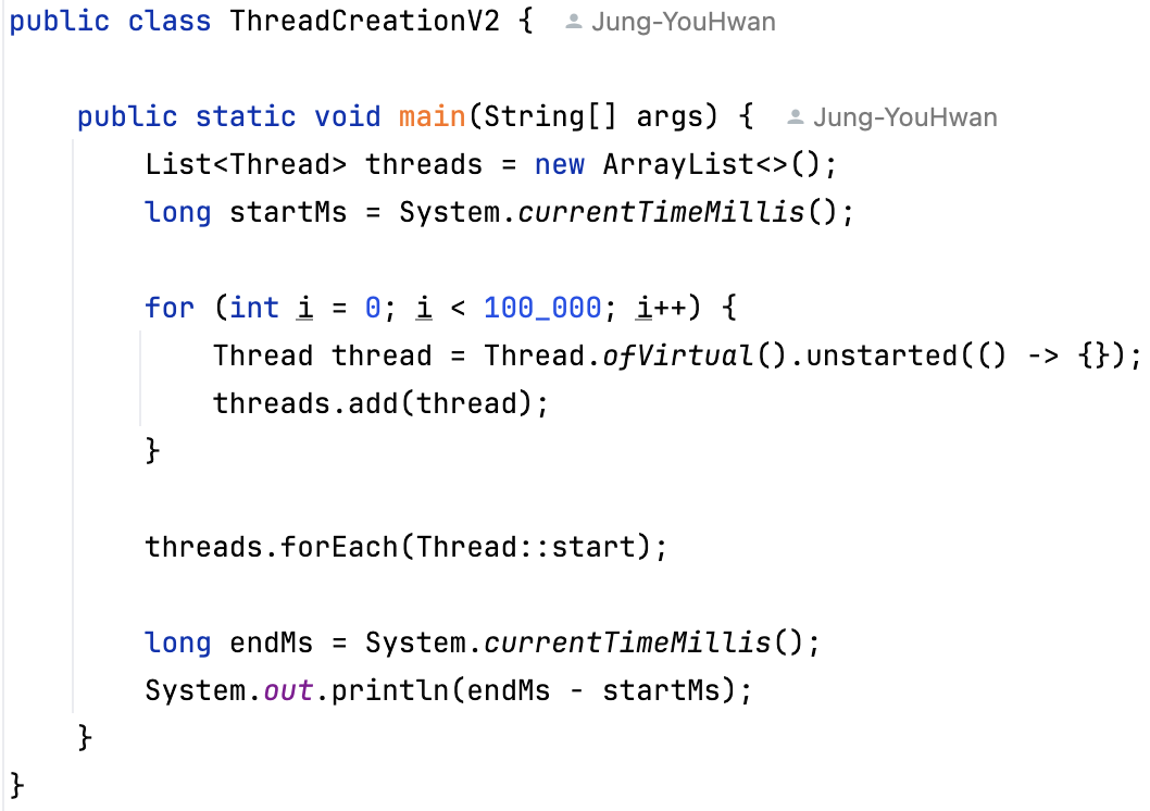 여기서 알 수 있는 점은 Virtual Thread는 생성/실행에 OS가 개입하지 않고 JVM 수준에서 관리된다는 것을 알 수 있습니다.