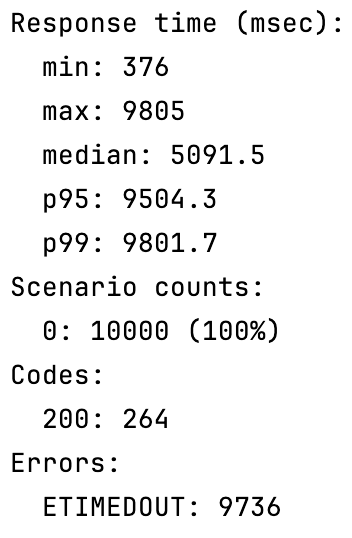 처리 시간이 오래 걸릴 뿐만 아니라 10000개 요청 중에서 264개만 성공하였습니다. accept-count의 수가 문제일 수도 있어서
