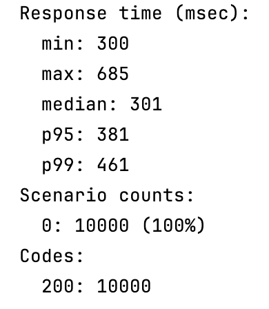 쓰레드 개수를 300개로 늘렸을 때는 10000개 요청이 모두 성공하였고 p99가 821ms가 나왔습니다.