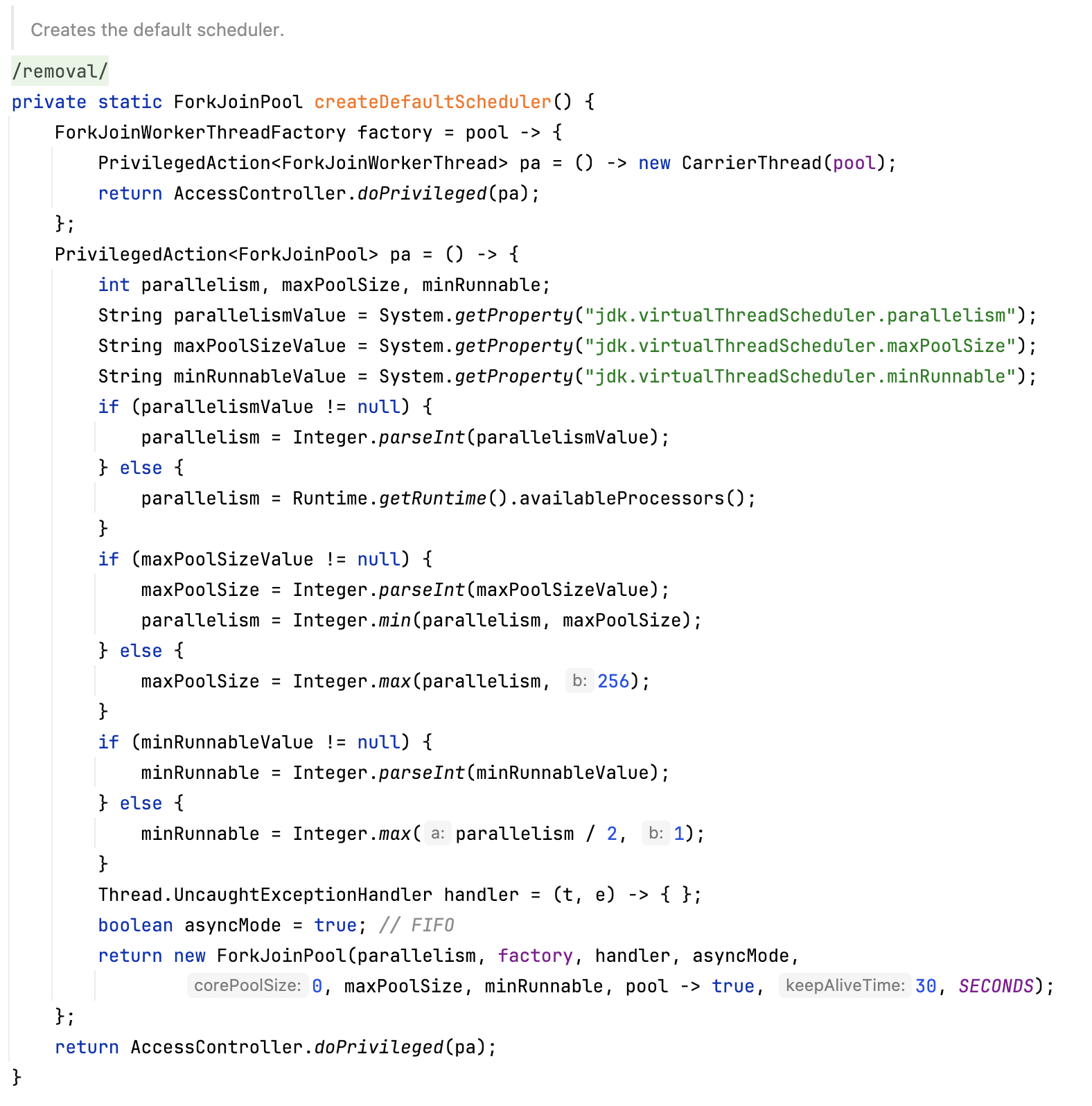 조금 더 들어가 Virtual Thread 클래스에서 DEFAULT_SCHEDULER를 생성하는 메소드는 다음과 같습니다.