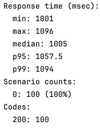 가장 빠르게 처리된 쓰레드는 1001ms 였고 가장 오래 걸린 쓰레드는 1096ms 이고 중간값은 1005ms로 나왔습니다.