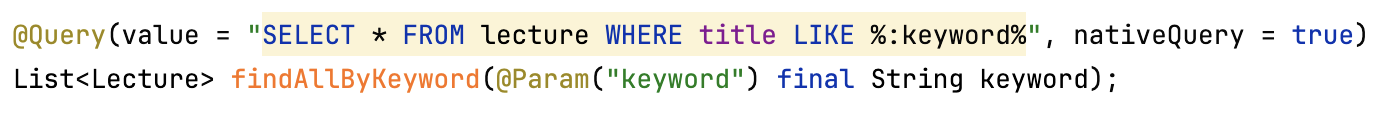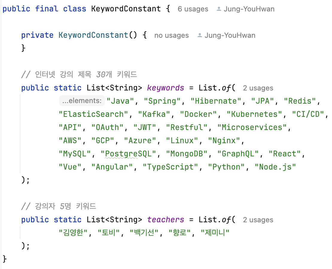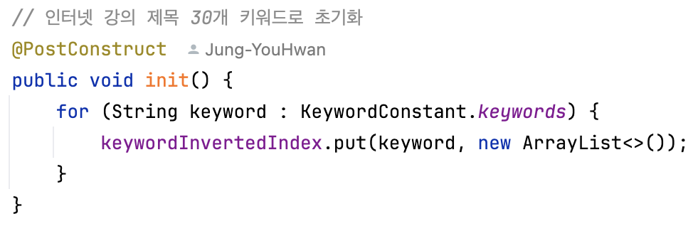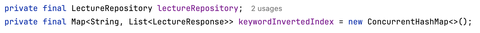 LectureRepository 뿐만 아니라 key-value 형식의 Map인 keyworldInvertedIndex도 생성하였습니다.