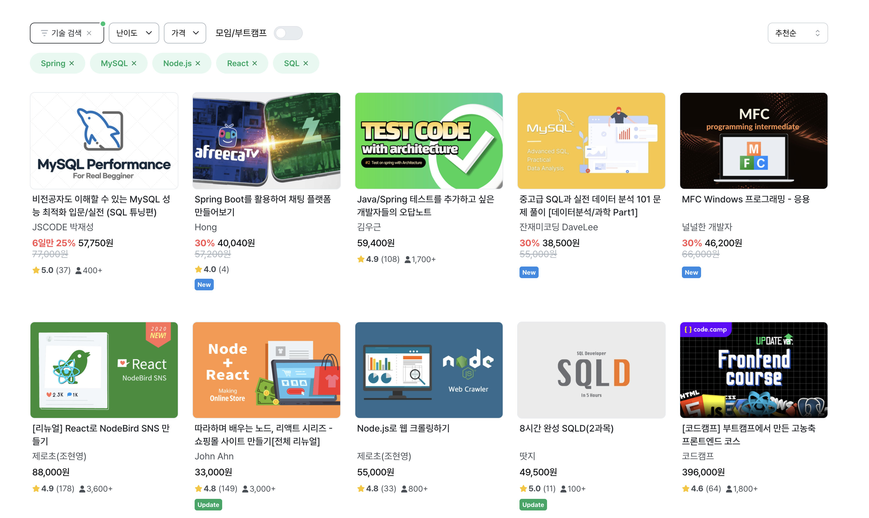 수많은 강의들이 있는데 Spring, MySQL, Node.js, React, SQL과 같은 키워드를 바탕으로 해당되는 강의들을 필터링해서