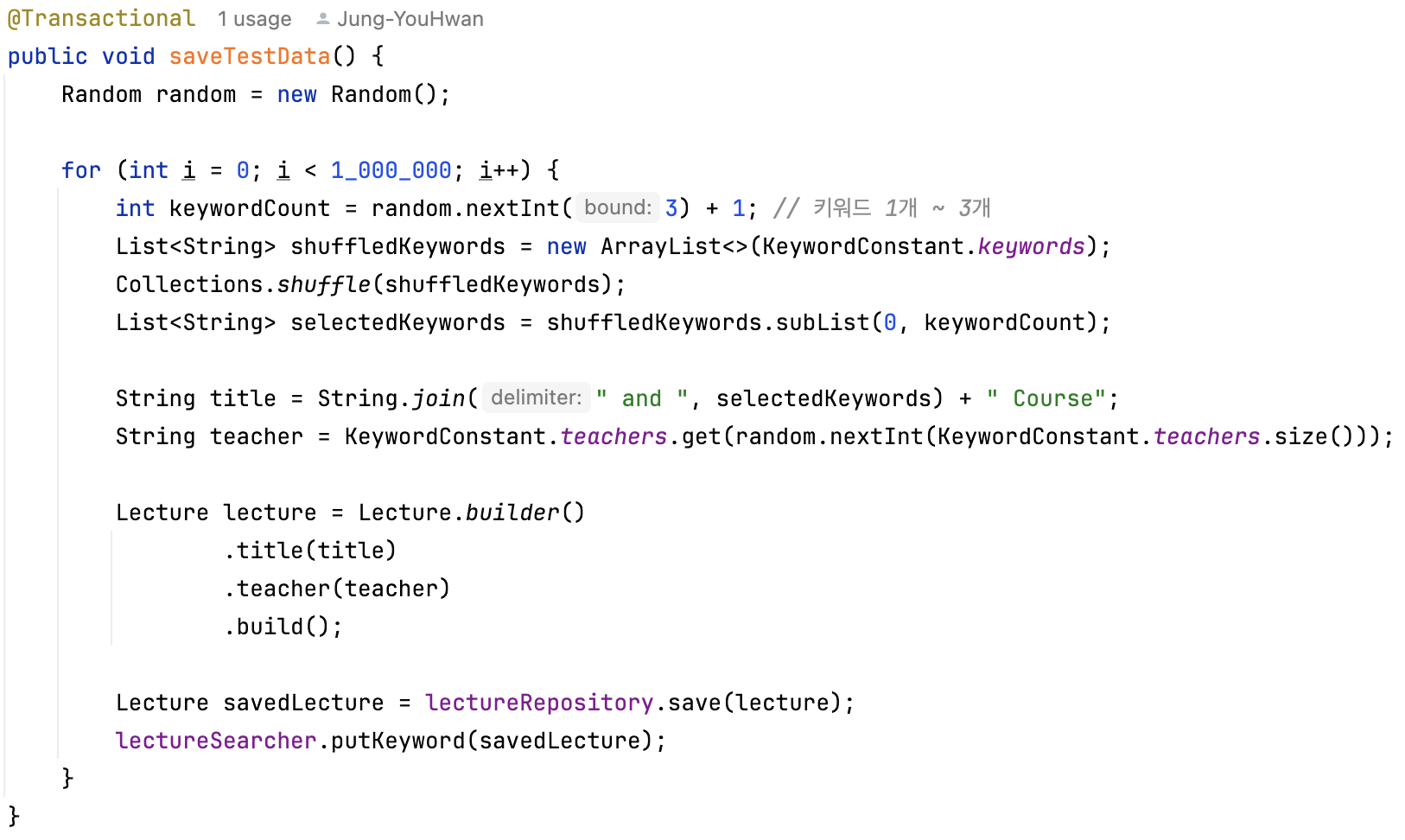 또 putKeyword() 라는 메소드를 통해 위에서 100만 건의 테스트 데이터를 저장할 때 lectureId, title, teacher 정보를