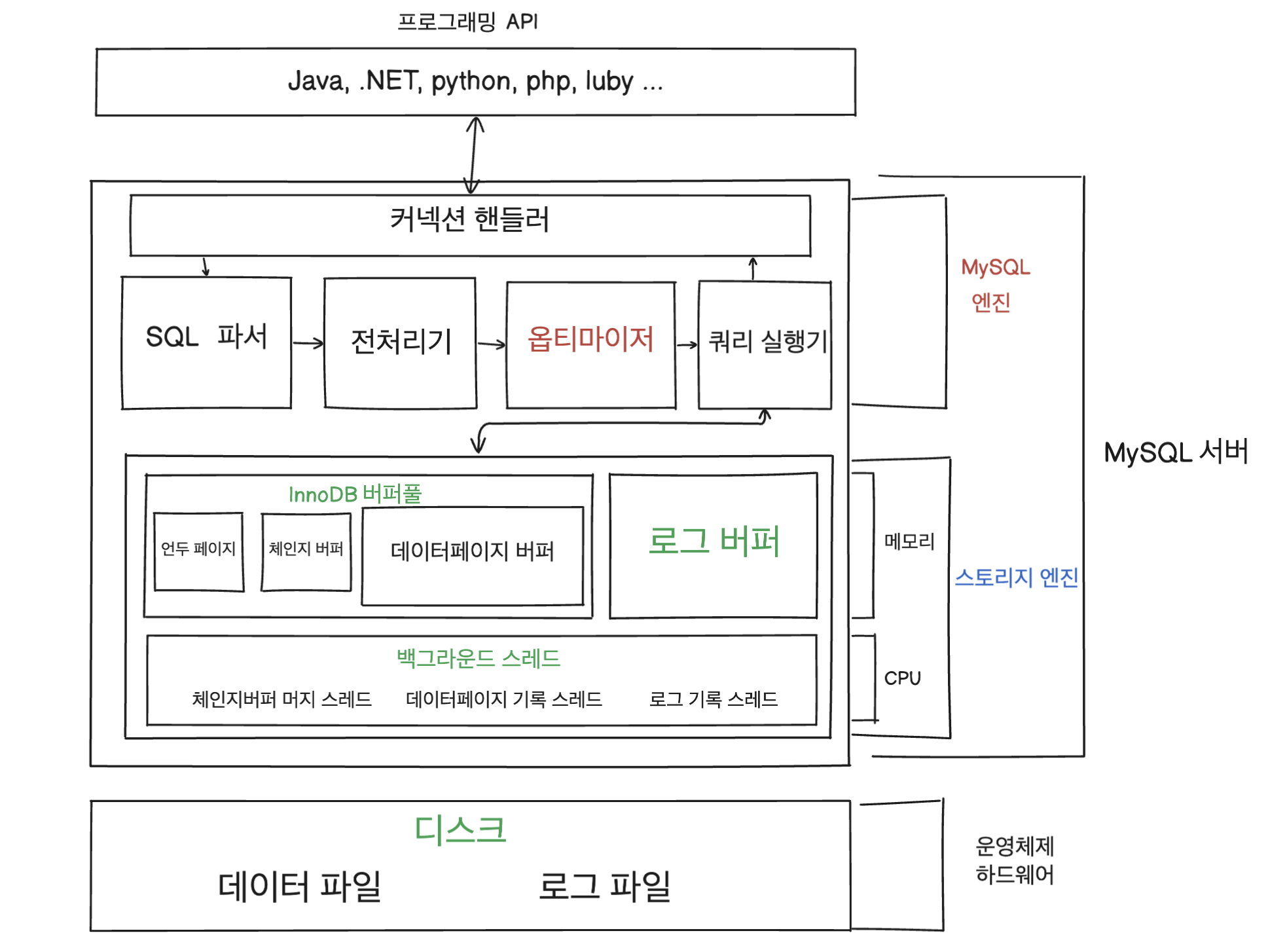 InnoDB 버퍼 풀이나 리두 로그를 버퍼링할 수 있는 로그 버퍼와 같은 자료 구조도 가지고 있습니다.