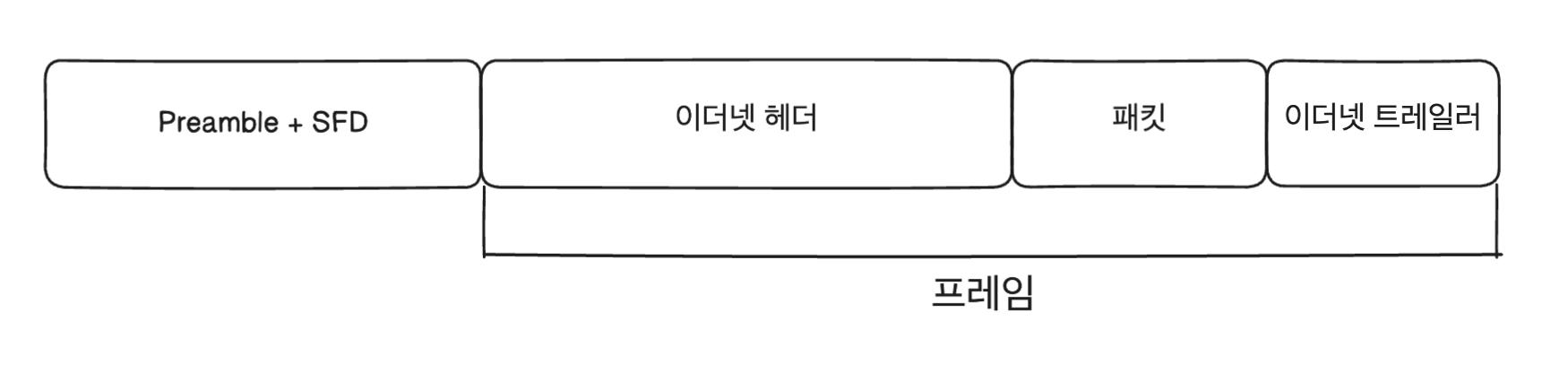 Preamble + SFD는 프레임 앞에 붙고 랜카드에게 이더넷 프레임이 시작한다는 사실을 알려줍니다.