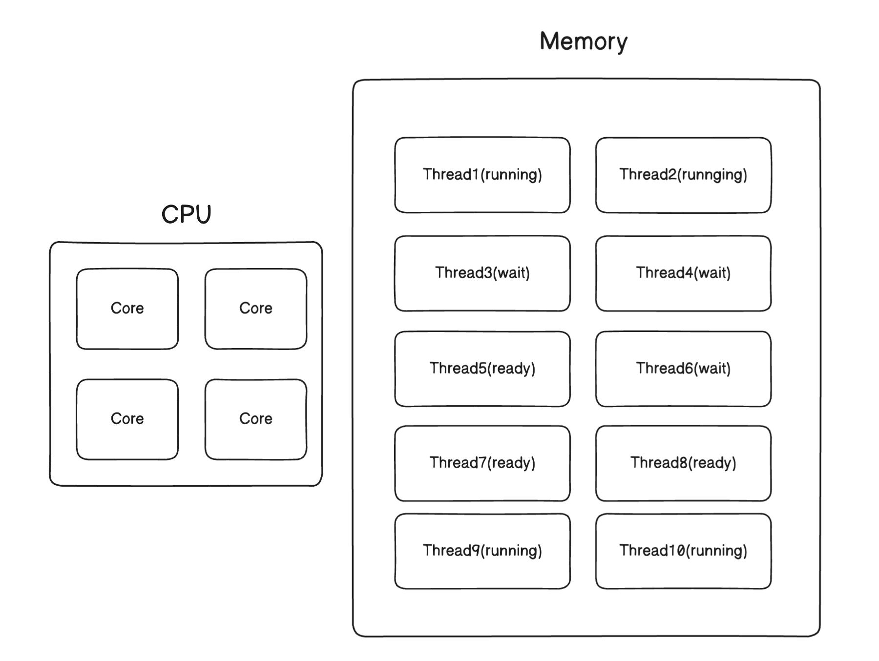 그림과 같이 4개의 CPU 코어가 있다면 10개의 쓰레드가 CPU 리소스를 필요할 때 Context-Switching 하며 각각 할당 받습니다.