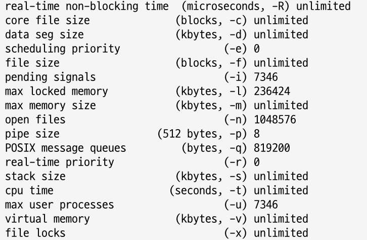 다음 리눅스 명령어를 통해 각종 최대 리소스 제한을 확인할 수 있습니다.