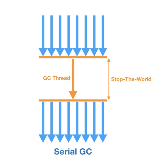 Serial GC는 하나의 쓰레드로 GC를 실행하여 애플리케이션을 중지하고 GC를 실행하는 Stop the world 시간이 깁니다.